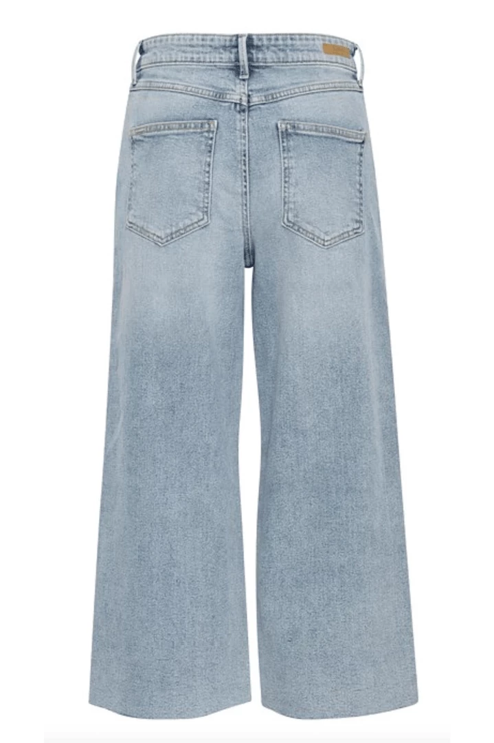 Stylish and relaxed high waisted stretch cropped jeans in light blue denim with raw frayed edge hemlines. A gorgeous fitting spring summer jean that can be worn with heels, trainers or sandals.
