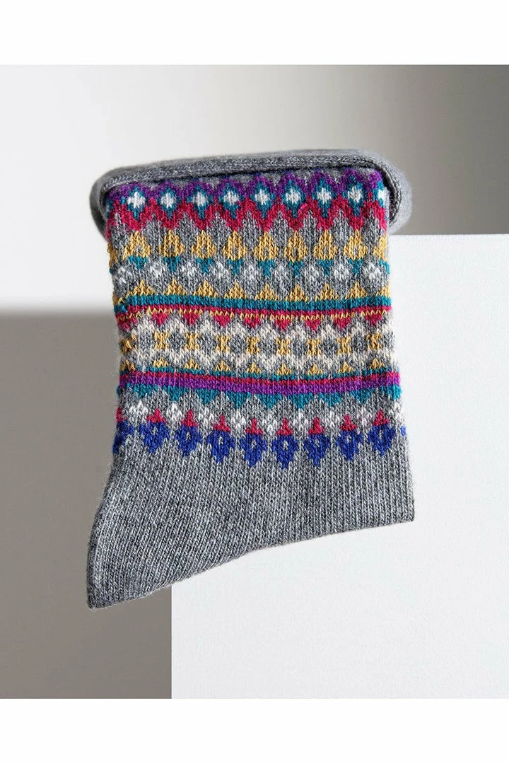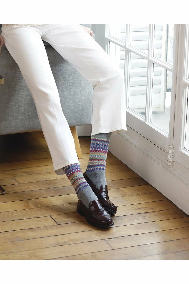 Bring the mountains to your feet in these stylish and comfortable Shetland style wool and cashmere socks. This luxurious combination of cashmere and wool is knitted into a thick fabric that makes these socks incredibly soft and warm. The rainbow Shetland style pattern is a warm and stylish nod to the mountain spirit. And it is precisely between two mountains that these Shetland style wool and cashmere socks are made. More precisely, they are knitted in France, in the Bleuforêt factory in Vosges, a guarantee of impeccable manufacturing quality.