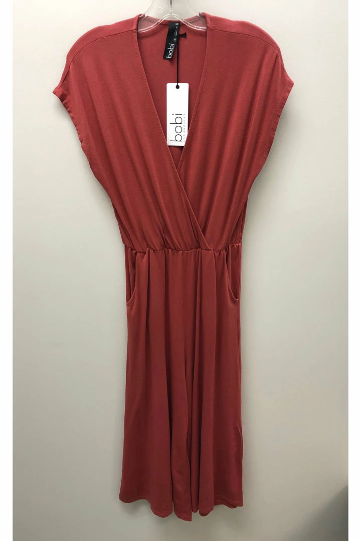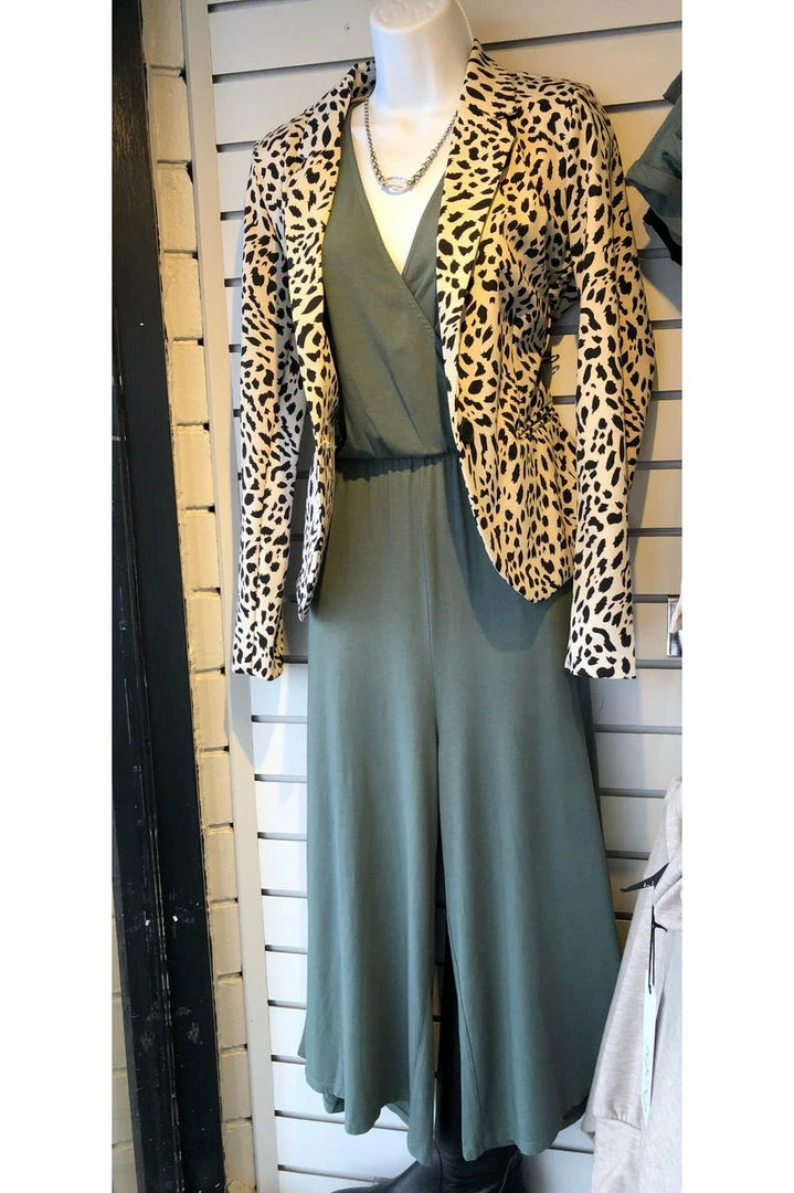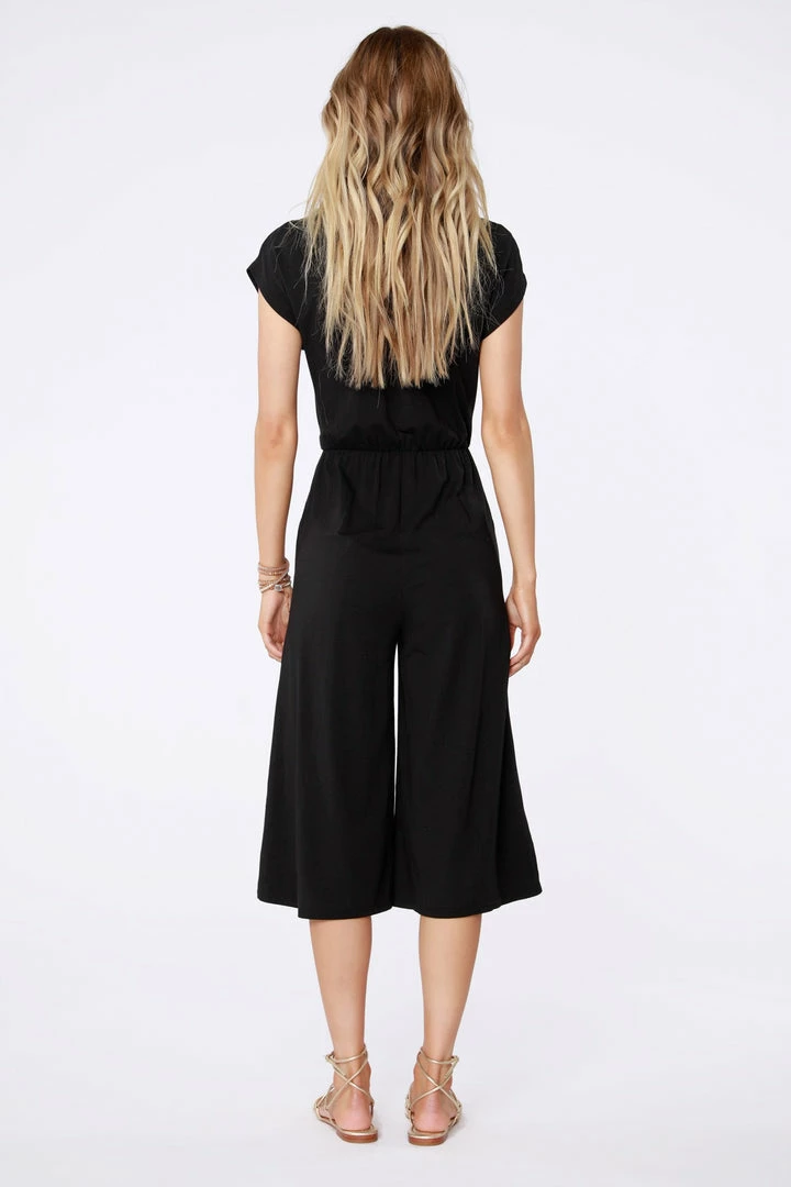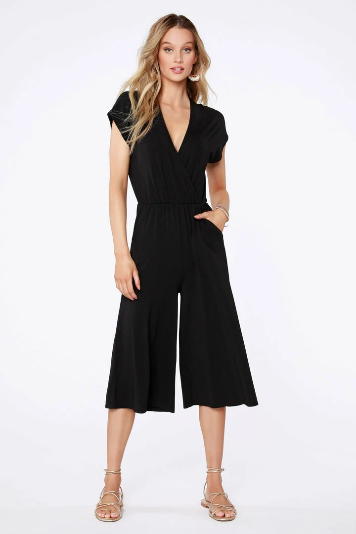 This jumpsuit will have you ready for anything! Designed with you in mind, it’s flattering with a cropped wide leg and cross over detail, but functional for every day with the jersey fabric and added pockets! Dress it up with heels and a jacket, or wear it with sandals when it starts to warm up again.Â