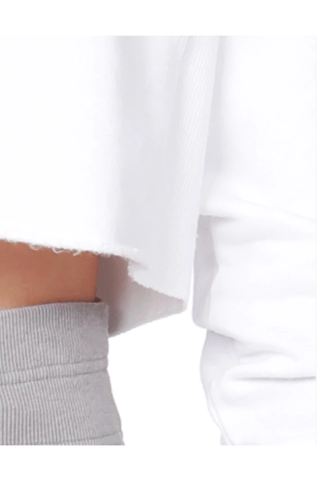 This cropped, boxy sweatshirt features a ribbed neckline, side panels and sleeve cuffs. Finish it off with raw edge details at the hem and you have a cute and sporty piece!Â