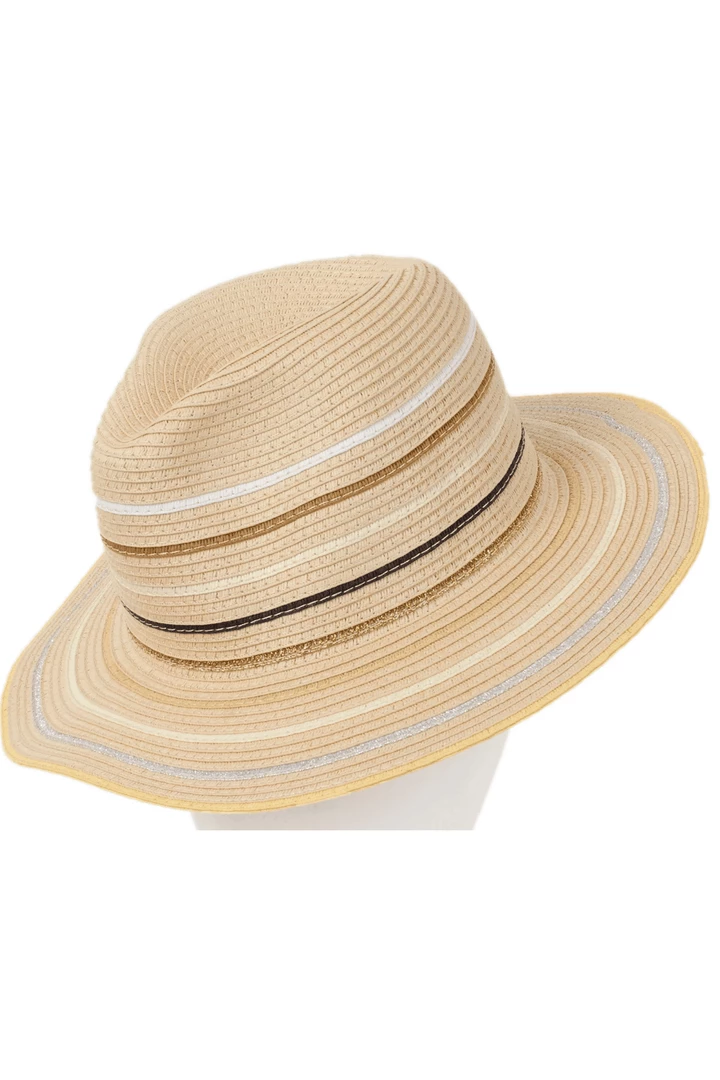 Bands of color offset this woven fedora. With a moldable brim that shields your eyes and protects your face from the sun, this hat looks so cute with a tassel trim pareo.