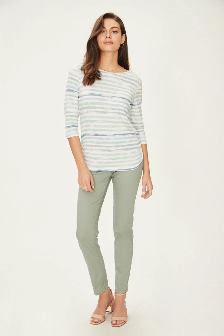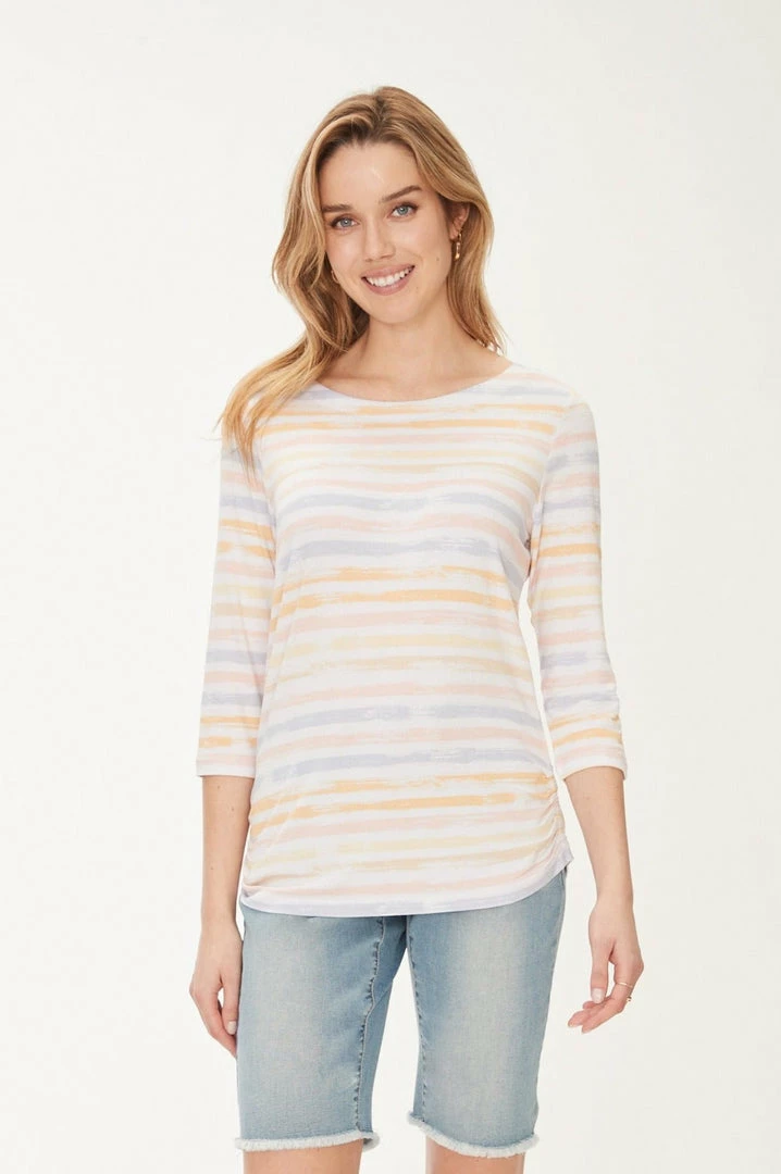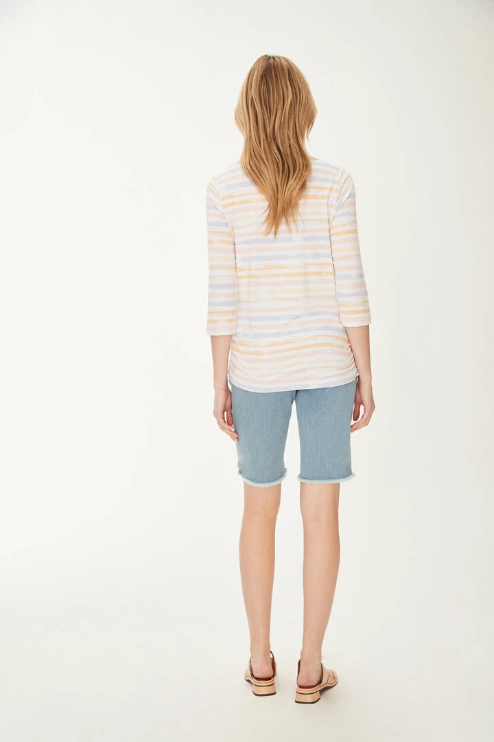 Nothing says warm weather like a pretty pastel striped shirt! Our version in easy-wearing crepe jersey features 3/4 length sleeves and a rounded bottom hem. Available in three delicious colors.