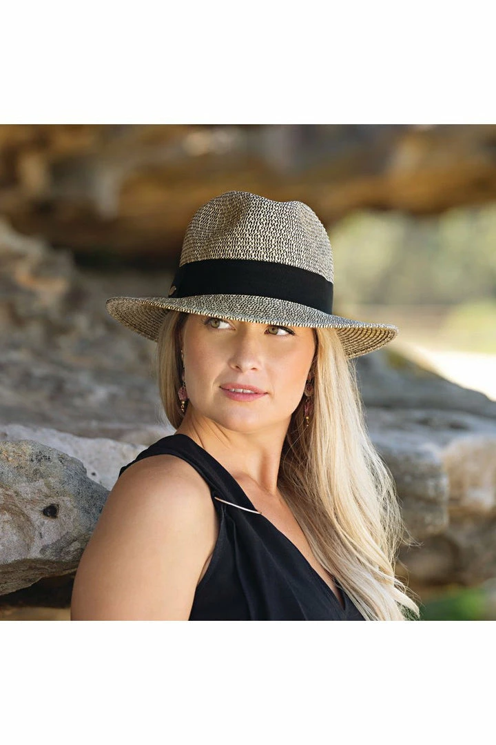Classic fedora style with a splash of sophistication and grandeur. The Josie features a moldable wire-edged brim design with a sleek wide black ribbon band. This hat packs easily for photo shoots on the beach or tropical adventures.