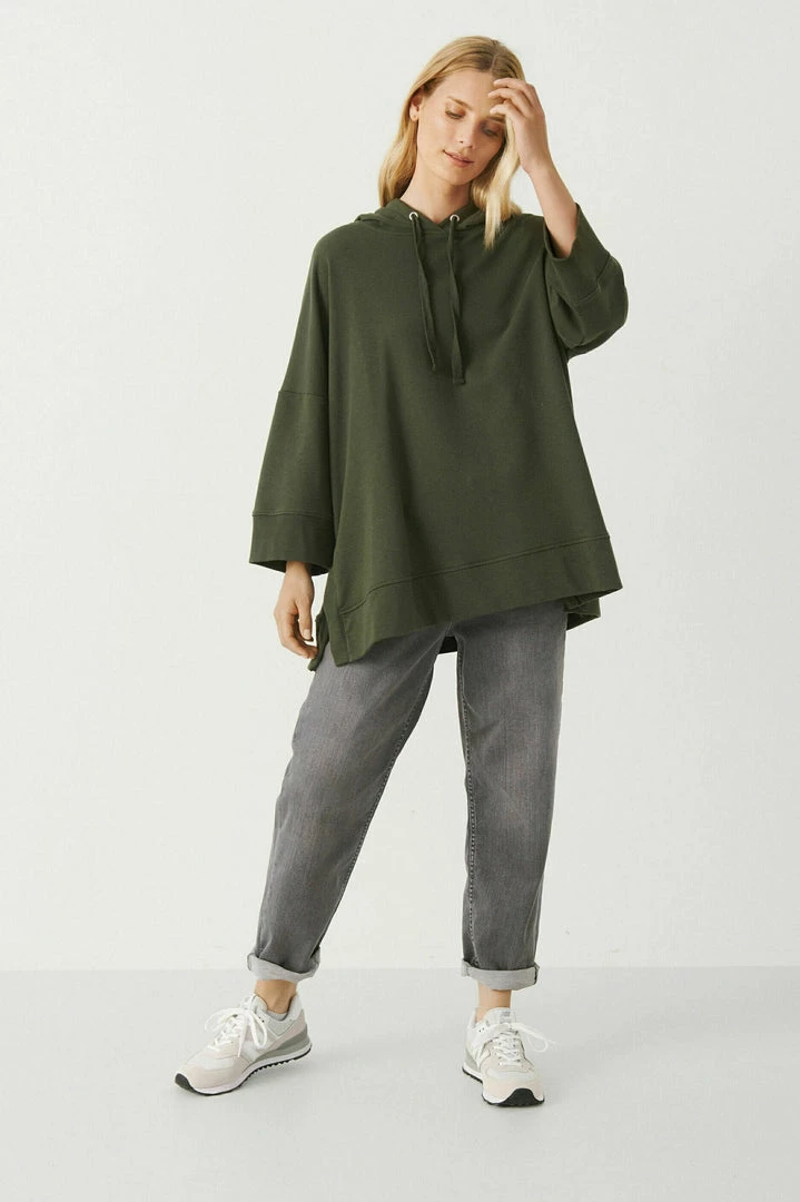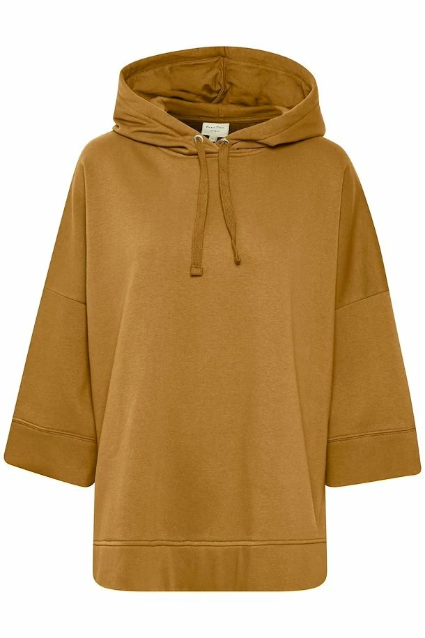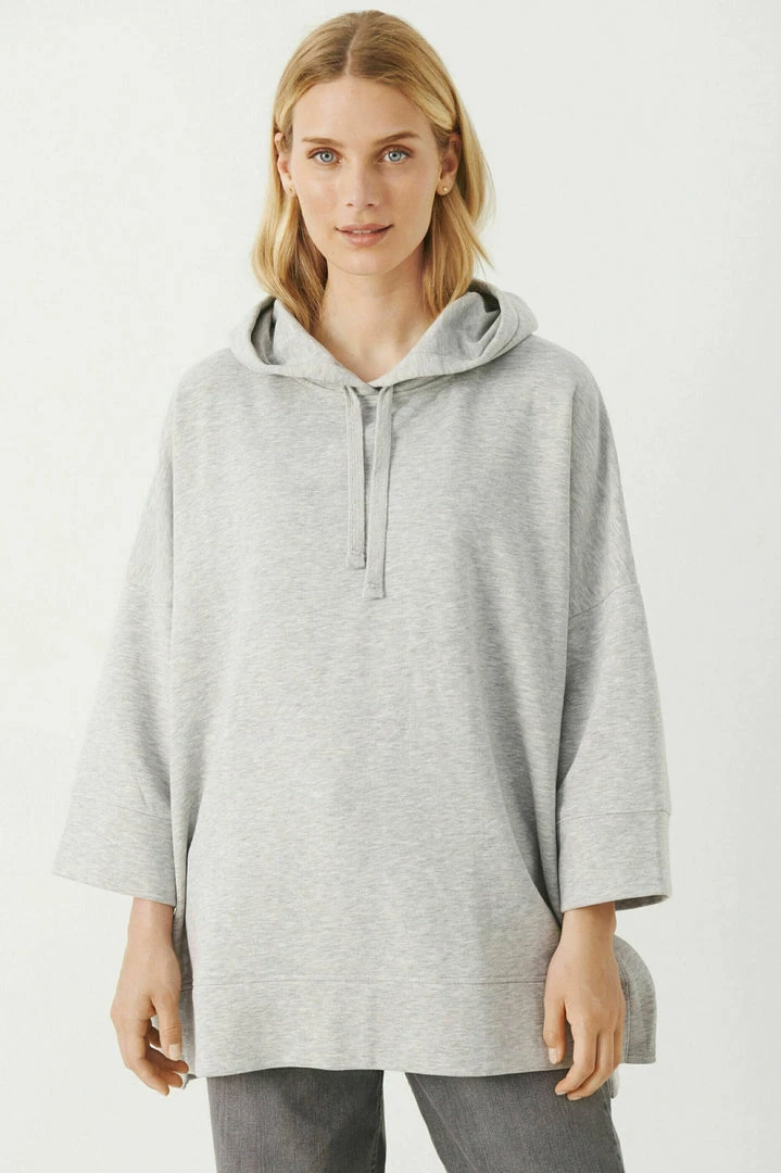 Part Two Kenzi Hoodie, a cotton blend sweatshirt with a hood and drawstring ties. This oversized and loose fitting sweater has 3/4 length sleeves.