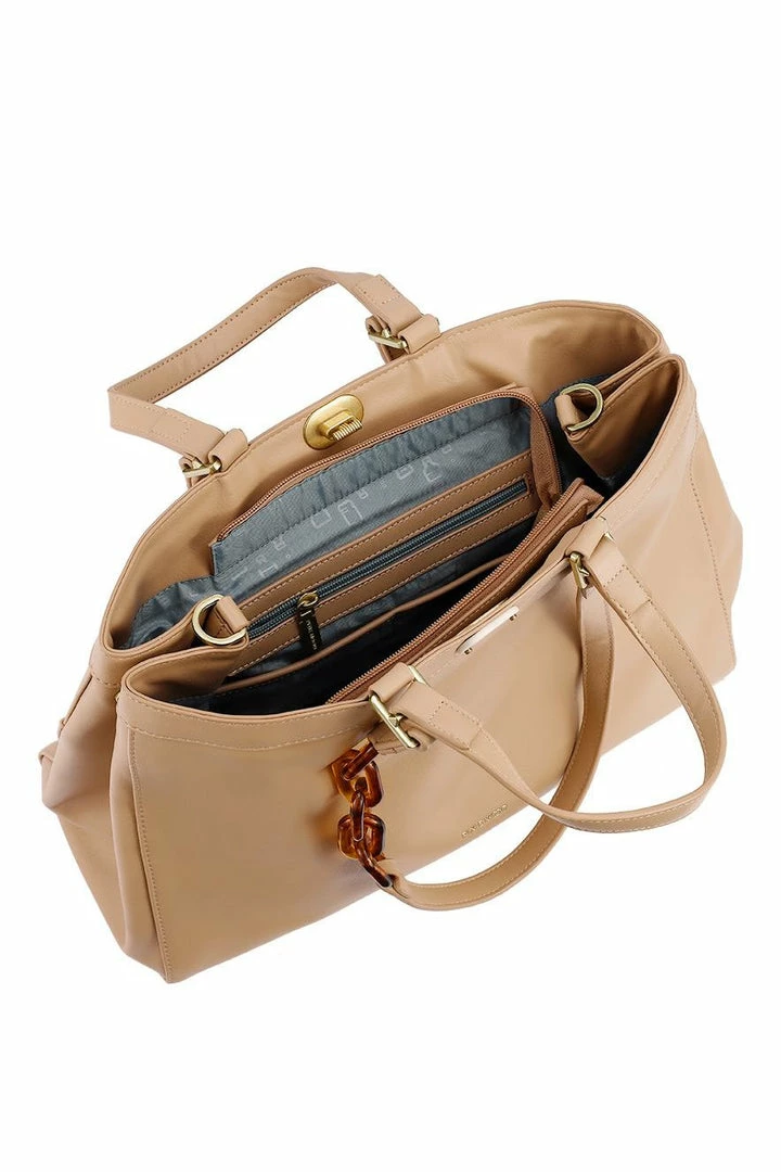 It’s all in the details! Dual handles, exterior slip pockets and a turn lock clasp makes this unique tote truly one of a kind.Â
