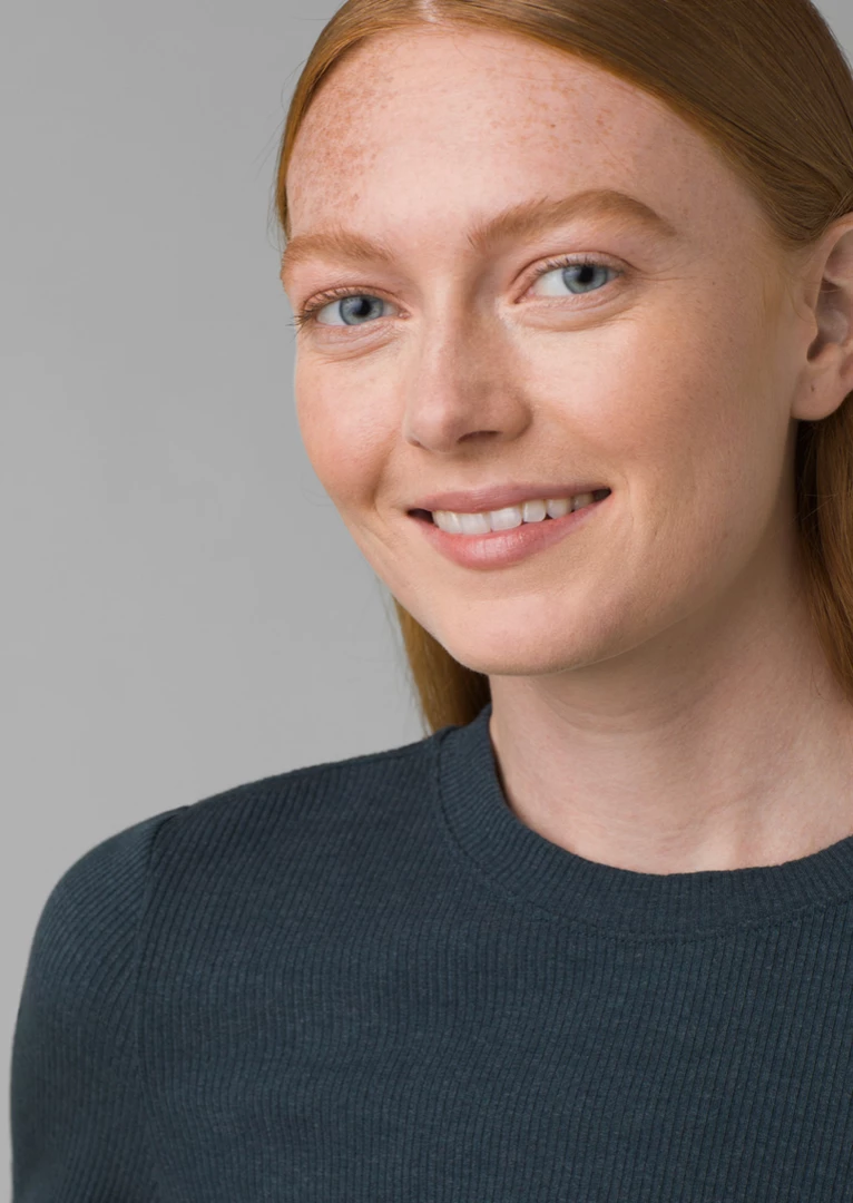 Lightweight TENCEL™ Modal stretch rib • Long sleeved mock neck turtleneck silhouette • Center back seam for shaping • Cuff at sleeve hem • Fitted