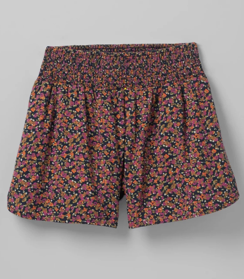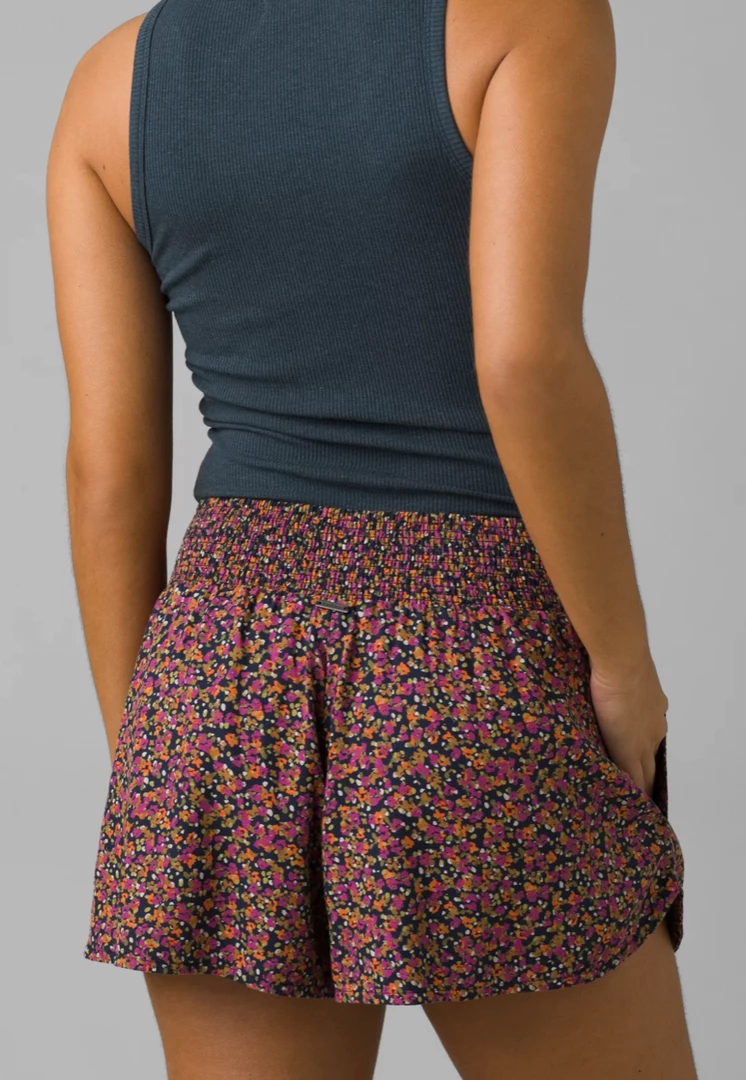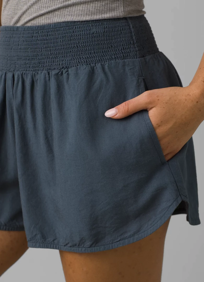 Pull on short with smocked waistband • Side seam pockets • Metal bar at back waistband