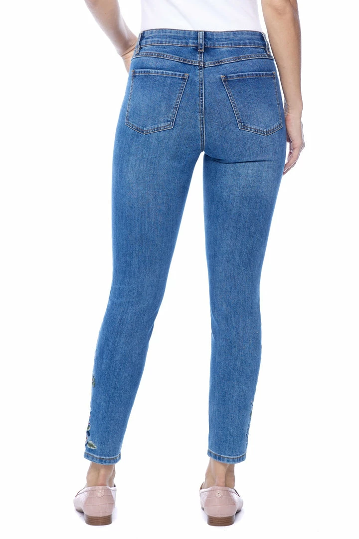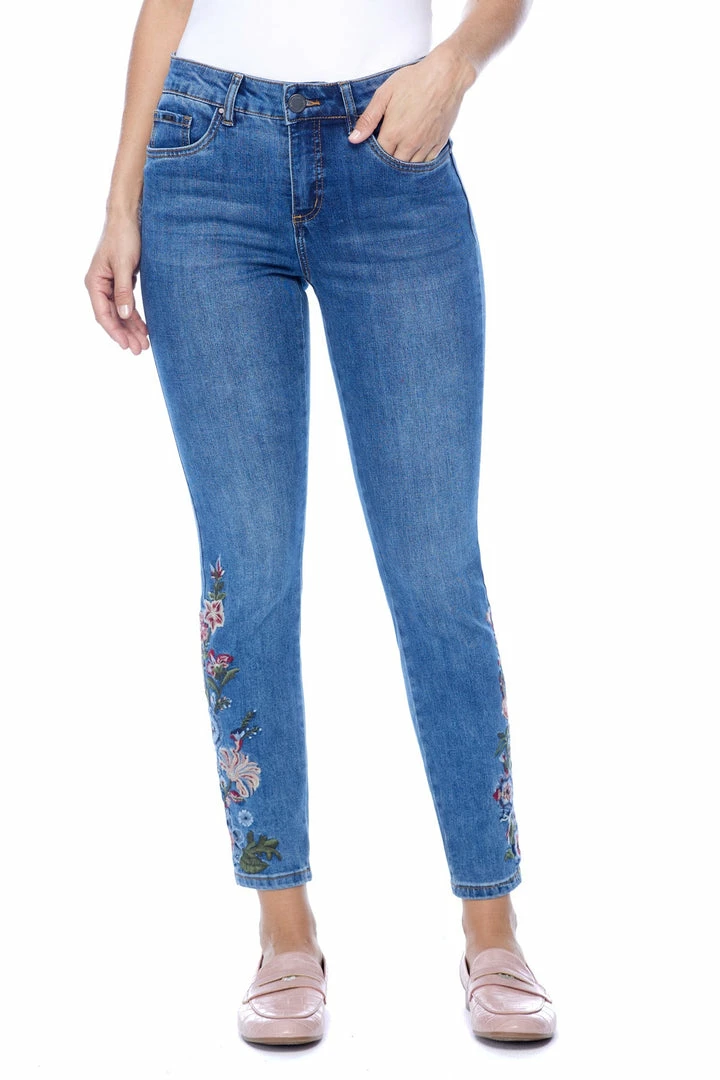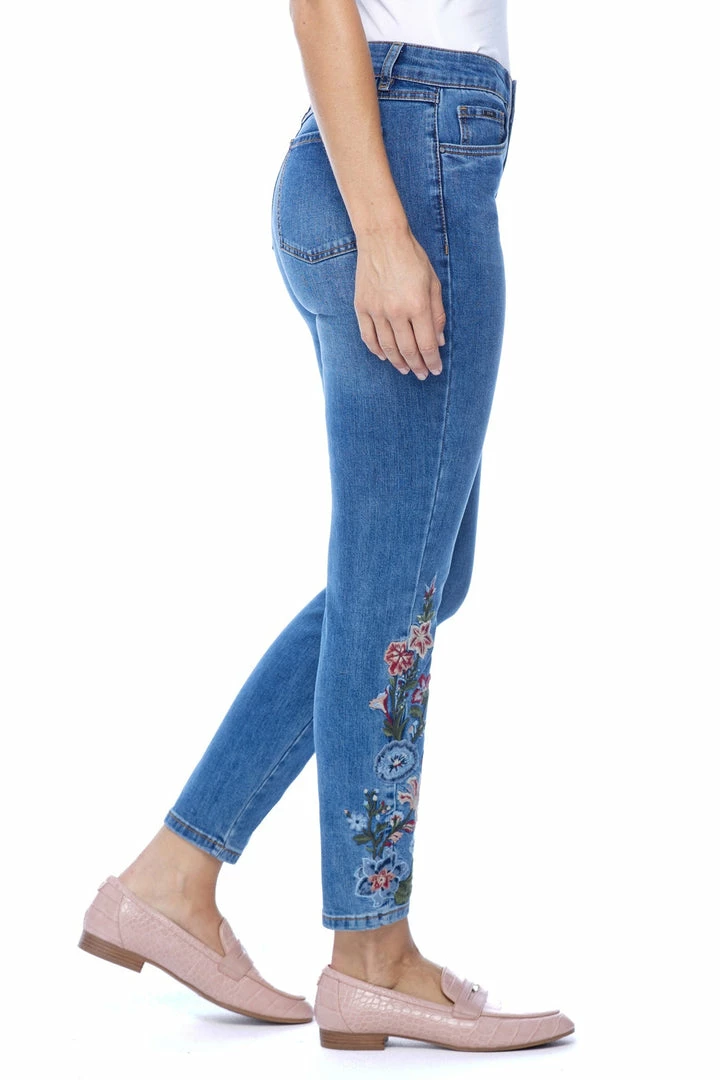 Our Olivia slim ankle jean with floral embroidery will put a smile on your face. Olivia is designed to flatter your curves with a contoured waist band that sits just below the natural waist