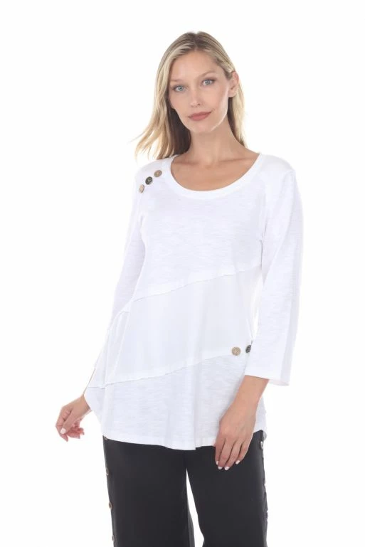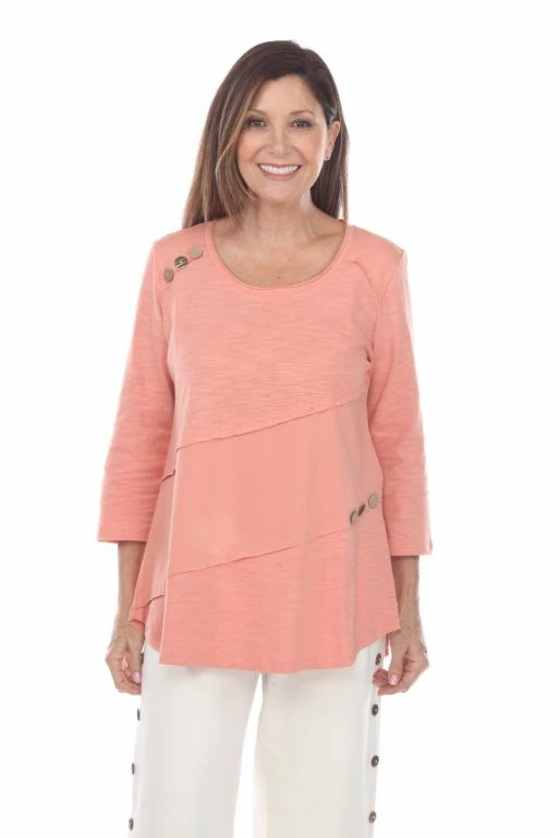 Three quarter length sleeves, wood button detailing, and a cute A-line hem? We’re in love. Wear this top on days that call for positive vibes, and stay breezy all day.