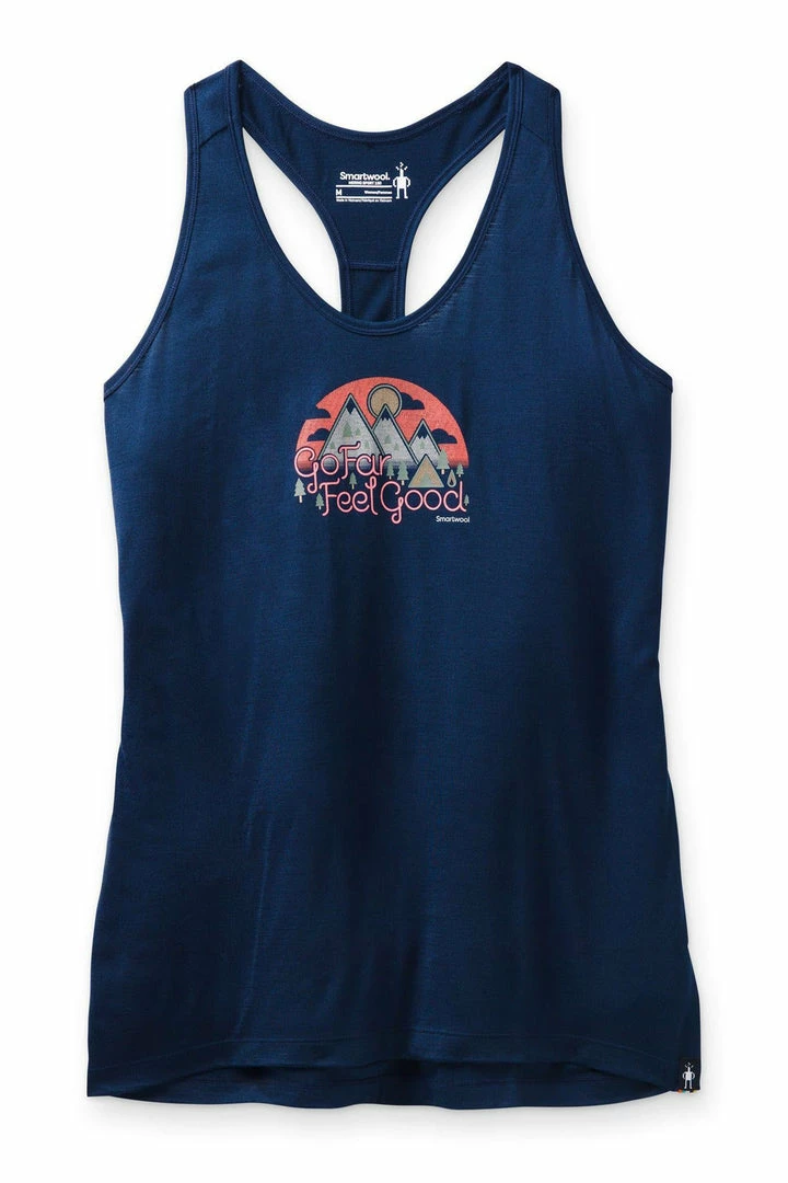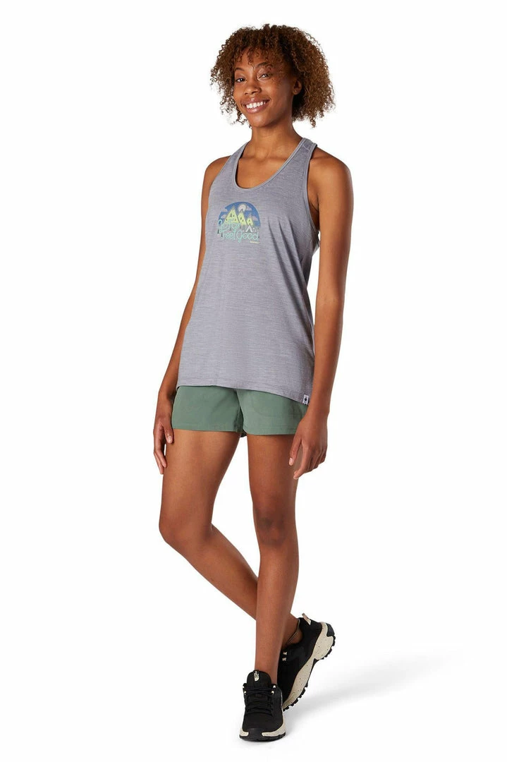 Go far and feel good. So we put our motto on this tank to remind you on every adventure. Our Women’s Merino Sport 150 Graphic Tank brings you all of the natural benefits of responsibly sourced Merino wool, as well as the durability and fast dry times of polyester. And it’s designed to help minimize chafing and maximize comfort while wearing a pack—so you can explore more with everything you need on you. Now, go far. And feel good.Fabric combines the moisture management, temperature regulation, and odor resistance of Merino with the durability and quick dry time of polyester
