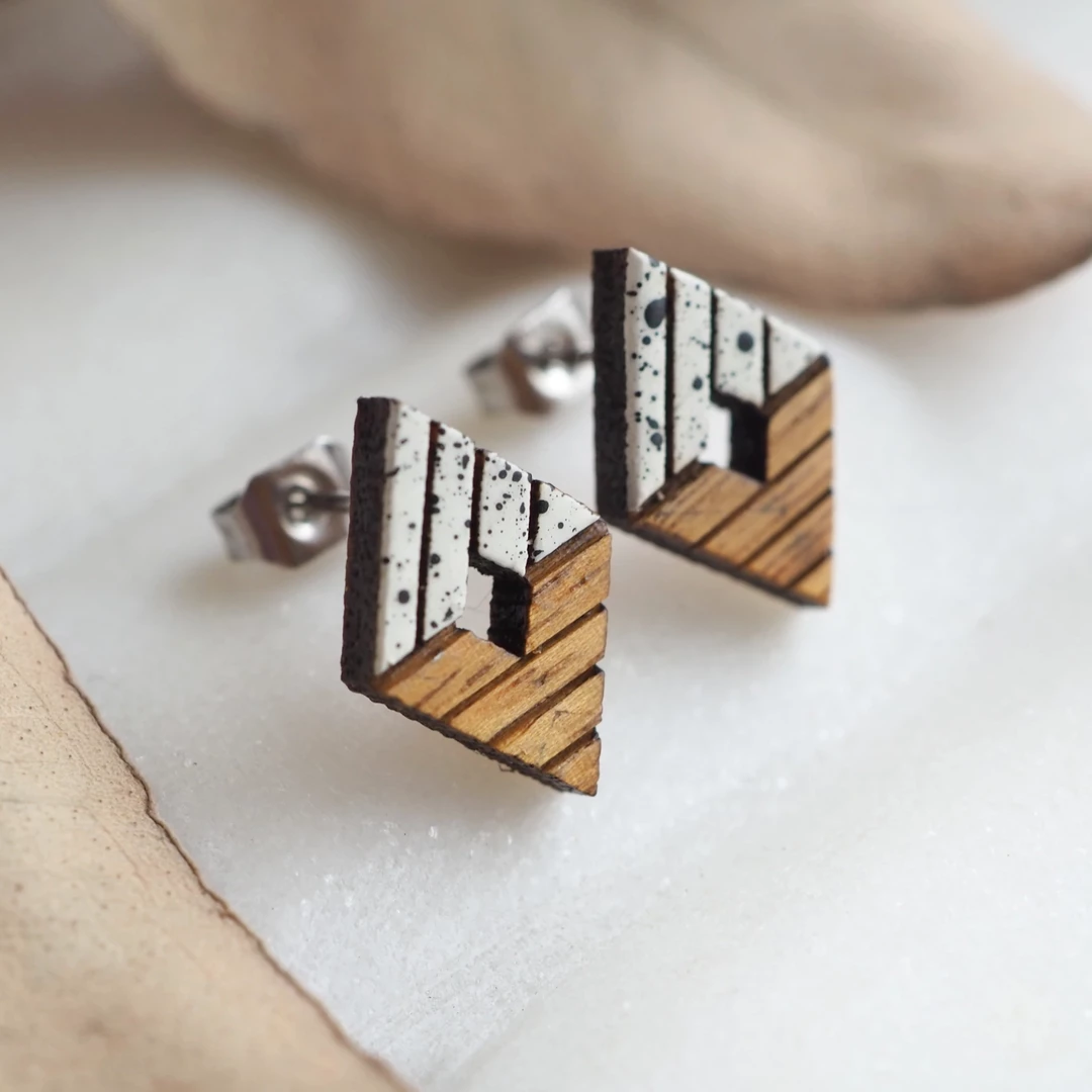 Inspired by one of our top sellers, the “Mini Colette” is the sassy little sibling to our popular “Colette” stud. This smaller version is made using canary wood and is available in a Ivory-black speckle and dark blue sage.