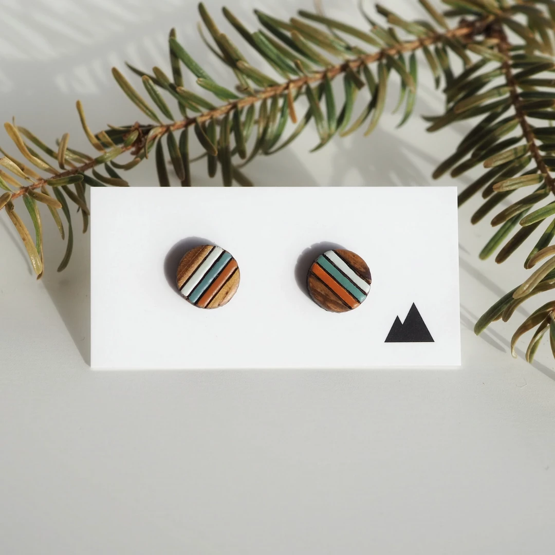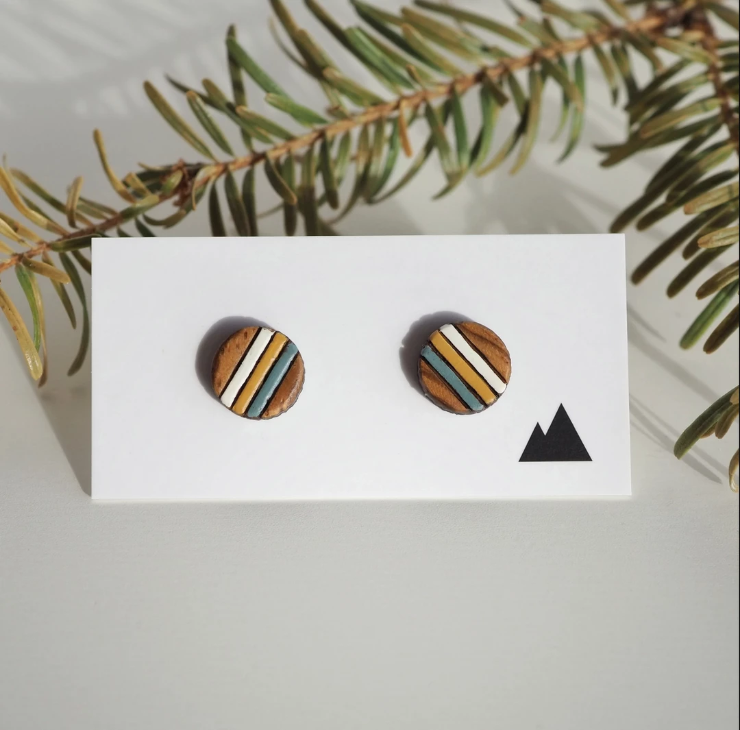 Channeling some retro vibes with these zebra wood striped studs. Available in two rad colorways.