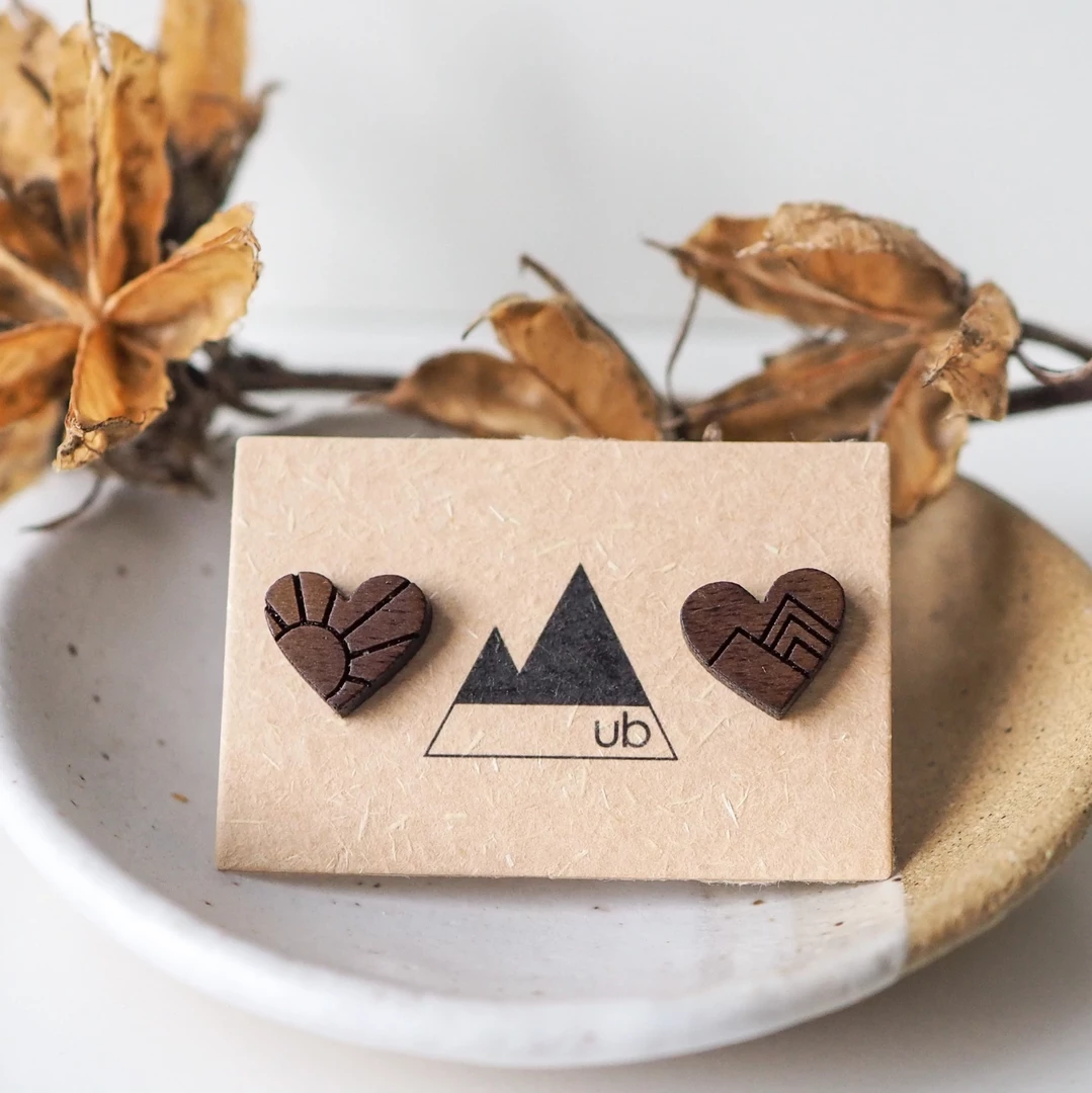 The perfect heart shaped maple earring has arrived. These adorable wood stud earrings are mismatched, showcasing the sun and the mountains, our favorite parts of sunset.