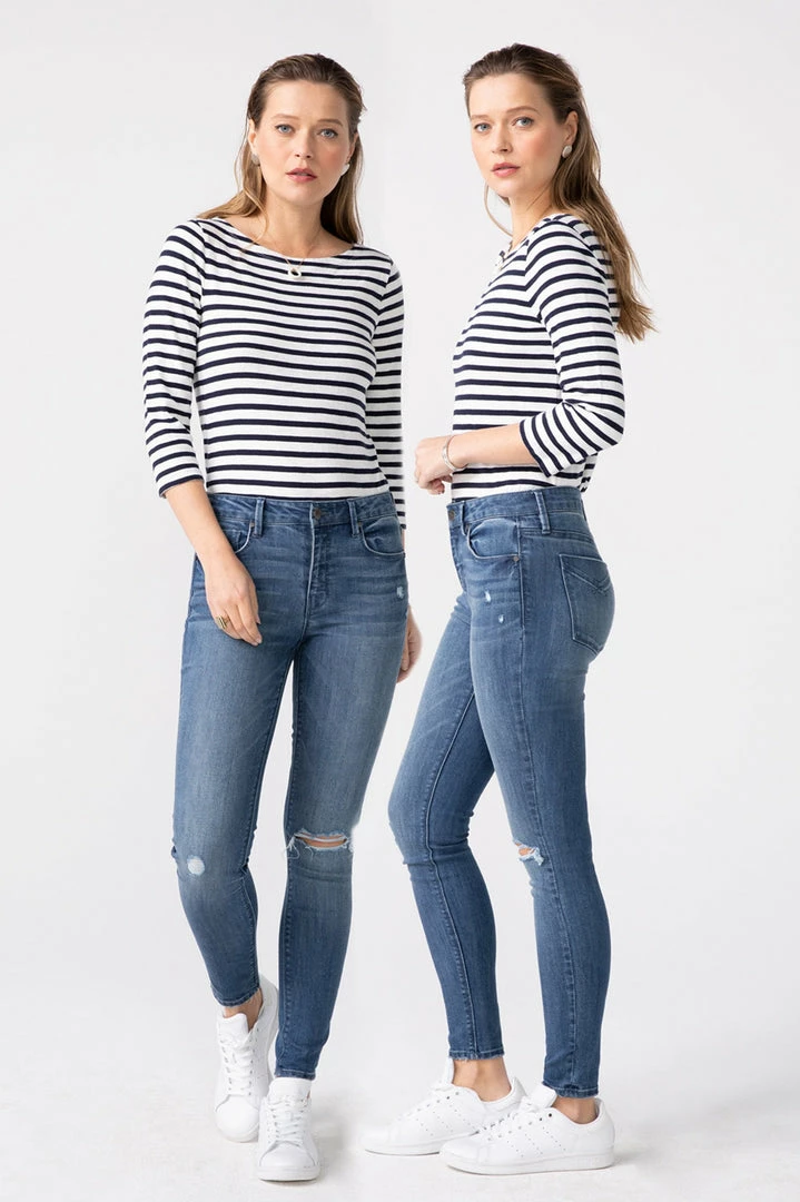 - Lean and sexy, these mid-rise skinny will hug you just right in our soft, super stretch quality denim. This style hits perfectly below your natural waist, is fitted through the hips and thighs and has a slim leg. The dark shade has mild hand sanding and whisker details for a slightly worn-in look. 5 pocket styling with a button and zip fly closure. Antique brass hardware with 2-tone stitching. Ankle length to show off those amazing shoes.