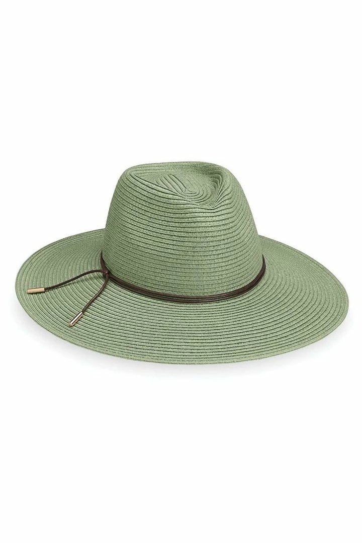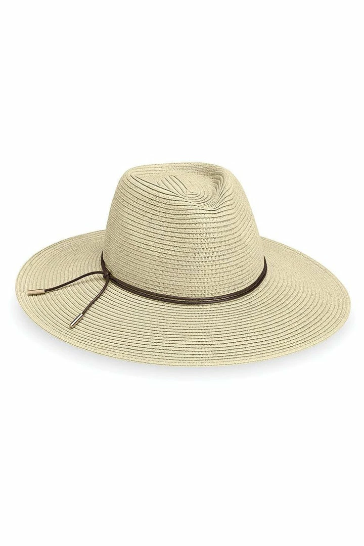 A broad-brimmed Rancher-style hat with clean lines for a modern, polished look. Head west with this wide-brimmed hat packed and ready for adventure. The faux leather cord with gold metal tips and neutral tones pair well for simple sophistication.