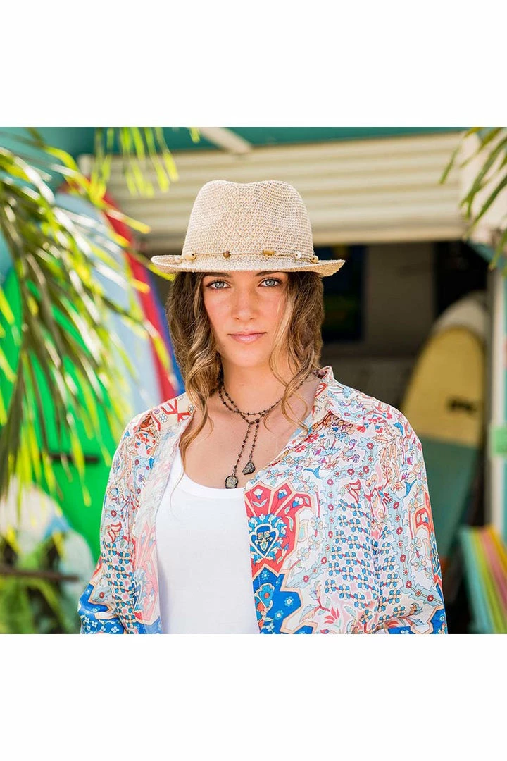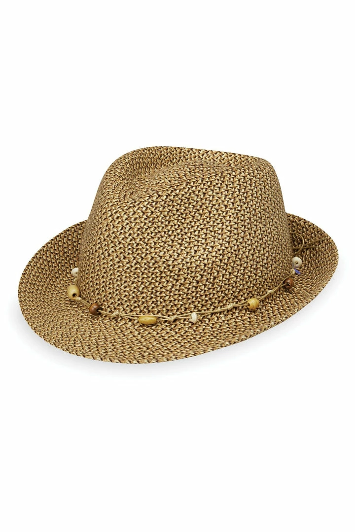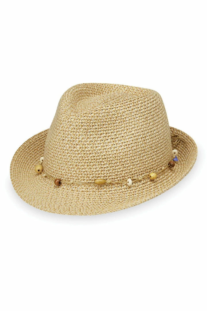 Ramp up your style with the youthful appeal of a trilby hat. The wood bead and waxed cotton cord trim complements this bohemian-style hat.