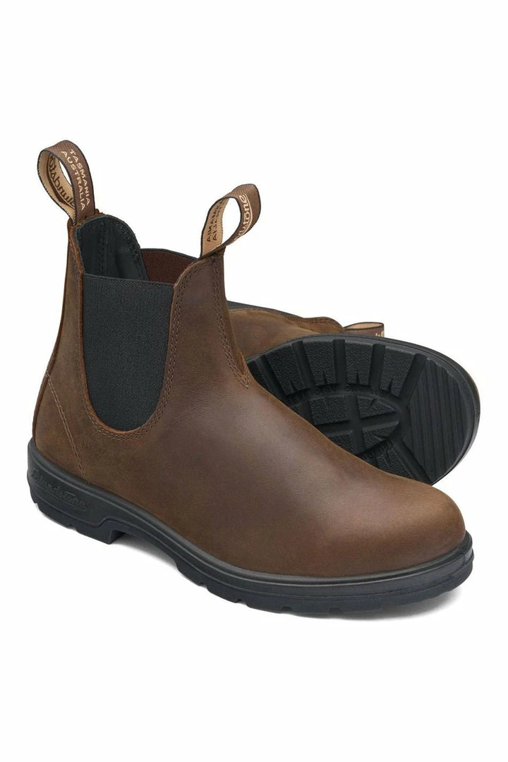 The Blundstone 1609 women’s Chelsea Boot from the classic collection. Crafted from premium and contoured to fit snugly and securely to your foot. A midsole made from polyurethane improves the underfoot comfort giving greater cushioning for your feet. Better shock absorption, provided in the boots by the Blundstone shock protection system fitted in the heel strike zone which also gives better stability. A front and rear pull tab with elasticated side gussets provide an easy pull-on. The footbeds fitted in all Blundstone footwear are removable as well as breathable and also washable. The iconic round toe design with coordinating elasticated panels complete the Blundstone look.